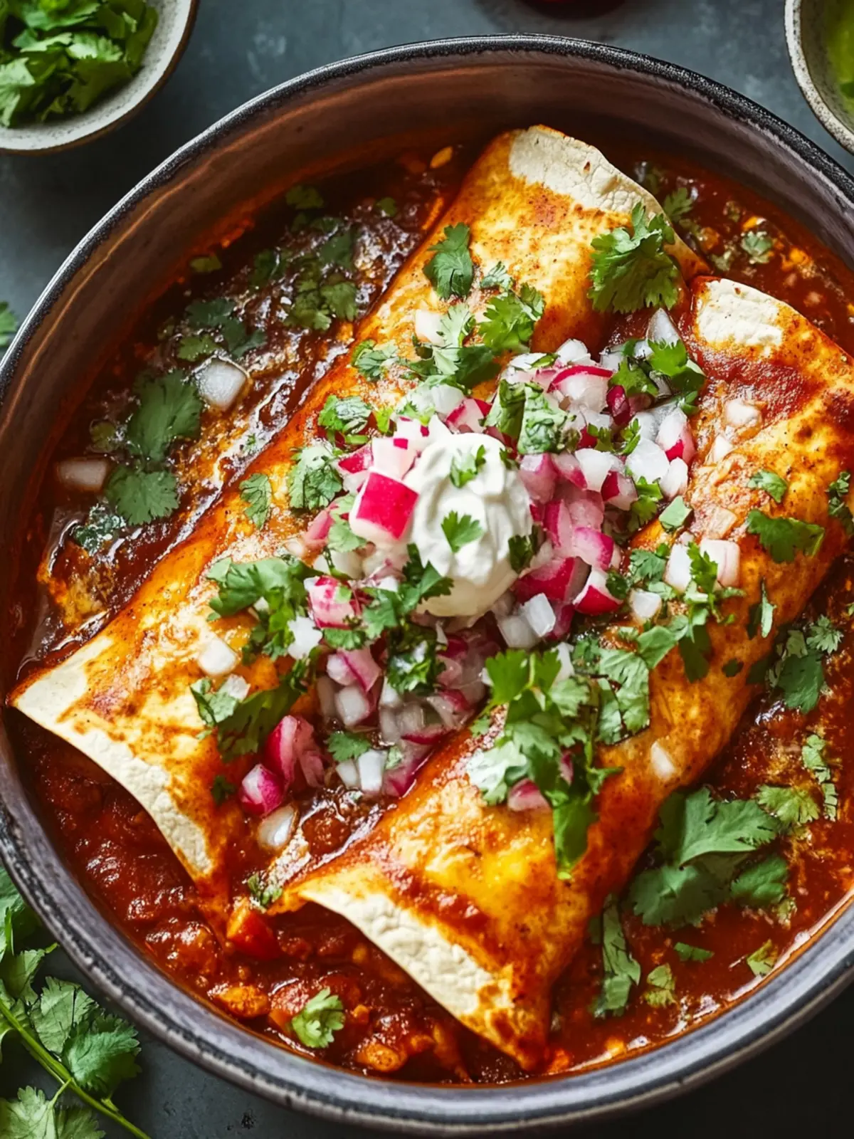 - Garnish: Allow the enchiladas to rest for about 5 minutes before garnishing with chopped onions, fresh cilantro, and a drizzle of crema. Serve with any extra consommé on the side.