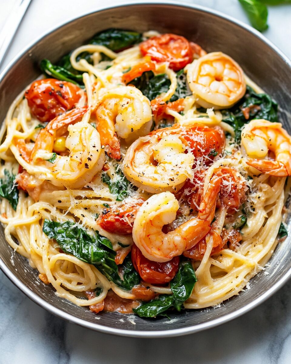 Pasta dishes have a rich history rooted in Italian cuisine, renowned for their simplicity and bold flavors. While traditional Italian recipes often highlight minimal ingredients, this recipe draws inspiration from both Mediterranean and contemporary cooking styles. The combination of shrimp, tomatoes, and spinach is not just about taste—it reflects a healthy Mediterranean diet that’s rich in vegetables, lean proteins, and heart-healthy fats.