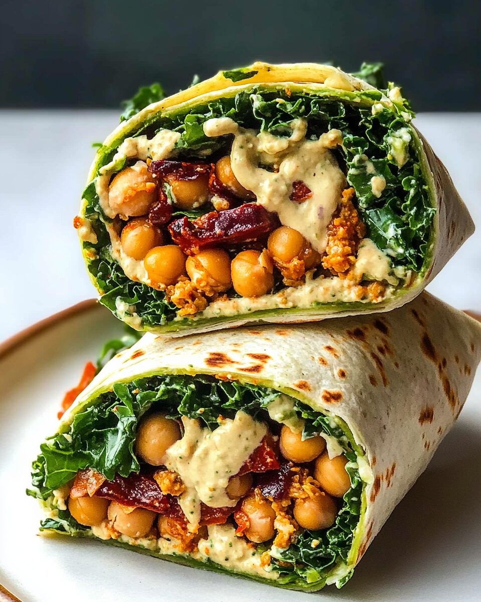 This recipe is inspired by the growing demand for plant-based meals that are both nutritious and full of flavor. Chickpeas have long been a staple in Mediterranean and Middle Eastern cuisines due to their high protein and fiber content. When roasted with buffalo sauce, they take on a spicy, crispy texture that makes them the perfect alternative to meat-based fillings. Kale, often referred to as a “superfood,” adds a fresh and slightly earthy element to the wrap, balancing out the heat from the chickpeas. The tahini Caesar dressing brings a creamy, tangy component that ties everything together beautifully. It’s a healthier take on traditional Caesar dressing, as it replaces dairy and eggs with nutrient-rich tahini and lemon juice.
