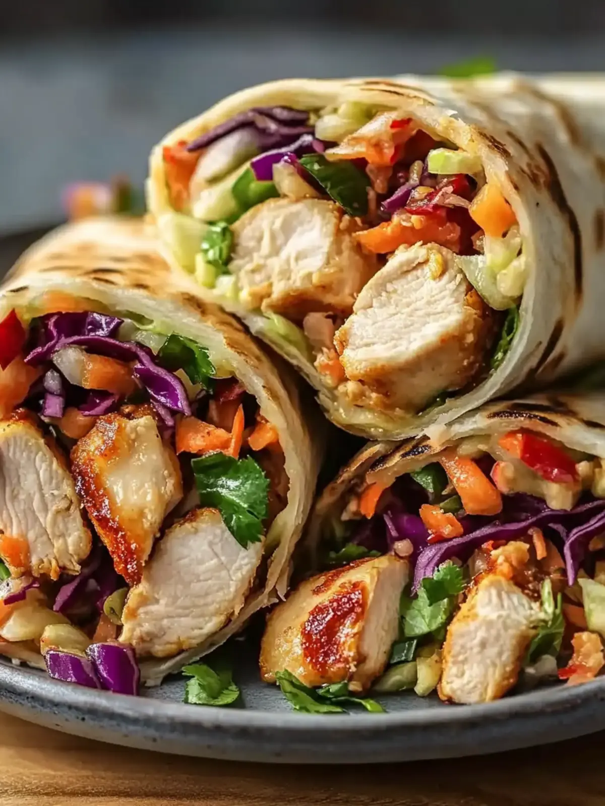 - Assemble the Wraps: Warm tortillas slightly, spread peanut sauce, add sliced chicken and Asian slaw, drizzle more peanut sauce, sprinkle with chopped peanuts, roll tightly, and slice.