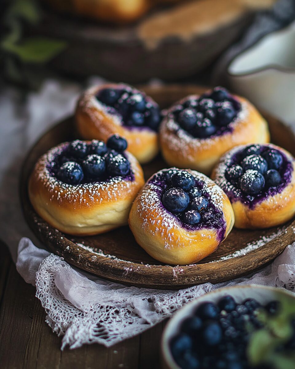 Wild Blueberry Ricotta Sweet Buns are a modern twist on a beloved Eastern European pastry known as Vatrushka (Ватрушка). These buns, traditionally made in Russia, Ukraine, and other Slavic countries, are known for their signature soft, yeasted dough filled with sweetened cheese, fruit, or even savory ingredients. The name “Vatrushka” is believed to have originated from the Old Slavic word vatra, meaning “fire,” symbolizing the warmth and comfort of a freshly baked bun. Historically, Vatrushka buns were baked in large village ovens and served as a treat for celebrations, religious feasts, or family gatherings. They were often paired with tea or milk and enjoyed as a breakfast item or a comforting snack. By incorporating wild blueberries and ricotta cheese, this version of the classic Vatrushka bun adds a burst of natural sweetness and a creamy, tangy filling, making it both indulgent and nutritious.